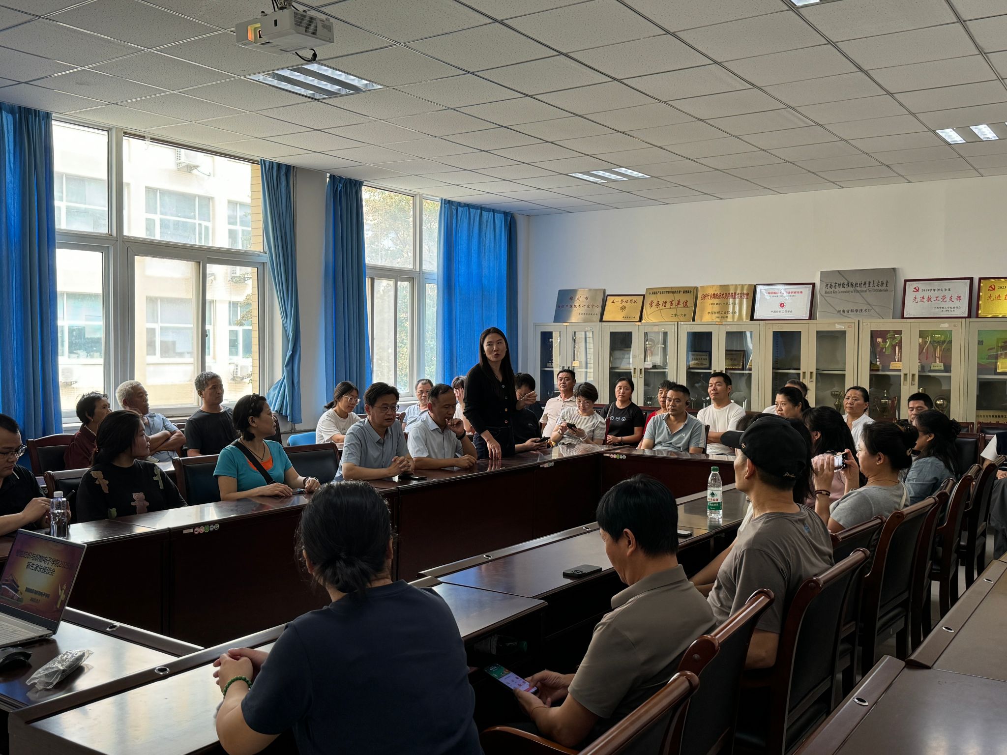 会前,播放了学校与学院宣传视频,生动展现了学校、学院的发展历程与整体风貌。吕继东代表学院对各位新生家长、新同学的到来致以热烈的欢迎。他重点介绍了学校发展历程、筹建河南电子科技大学情况,并聚焦纺织专业特色和学科优势,从课程体系设置到实践教学平台搭建,从专业学习到未来行业对接等一一做了介绍,从而能更有针对性地对学生的未来发展进行全面规划。家长们感受到学校悠久的办学传统与坚实的发展基础,同时对学生将接受到良好的培养充满信心。