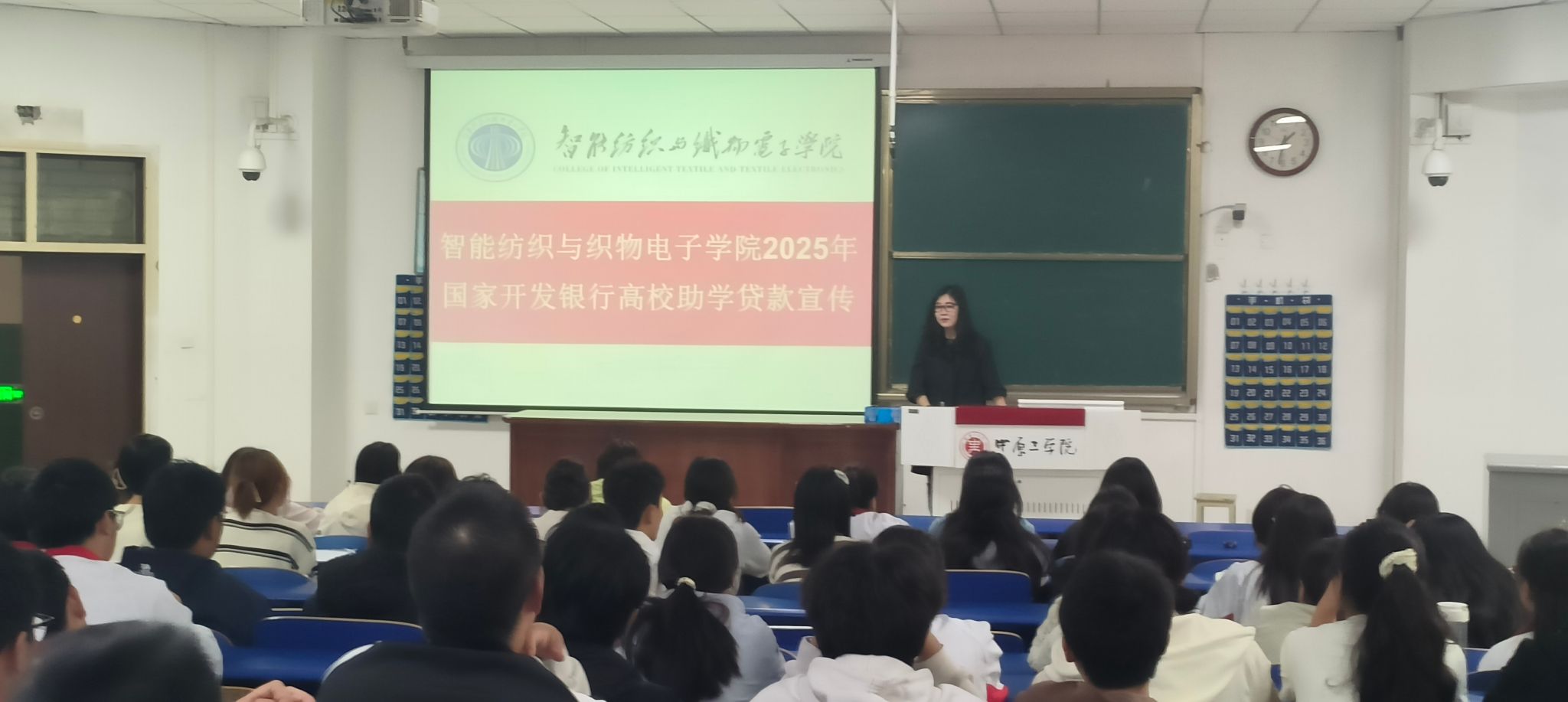 为帮助2025级新生深入了解国家开发银行高校助学贷款政策,打消学业经济顾虑,智能纺织与织物电子学院于2025年9月19日开展助学贷款专项宣讲会,由学生工作办公室主任杨娟娟老师主讲,学院新生到场参与。