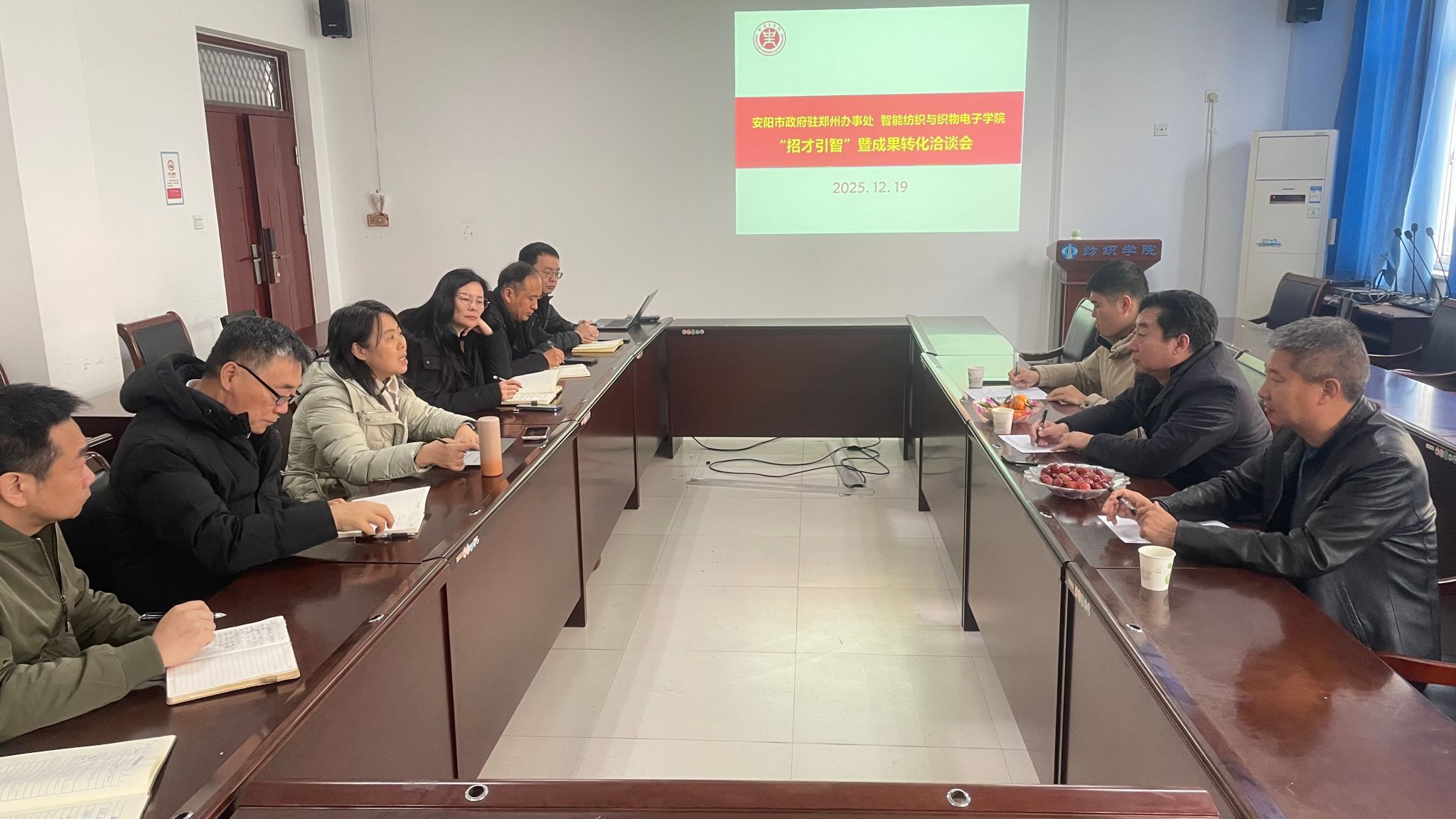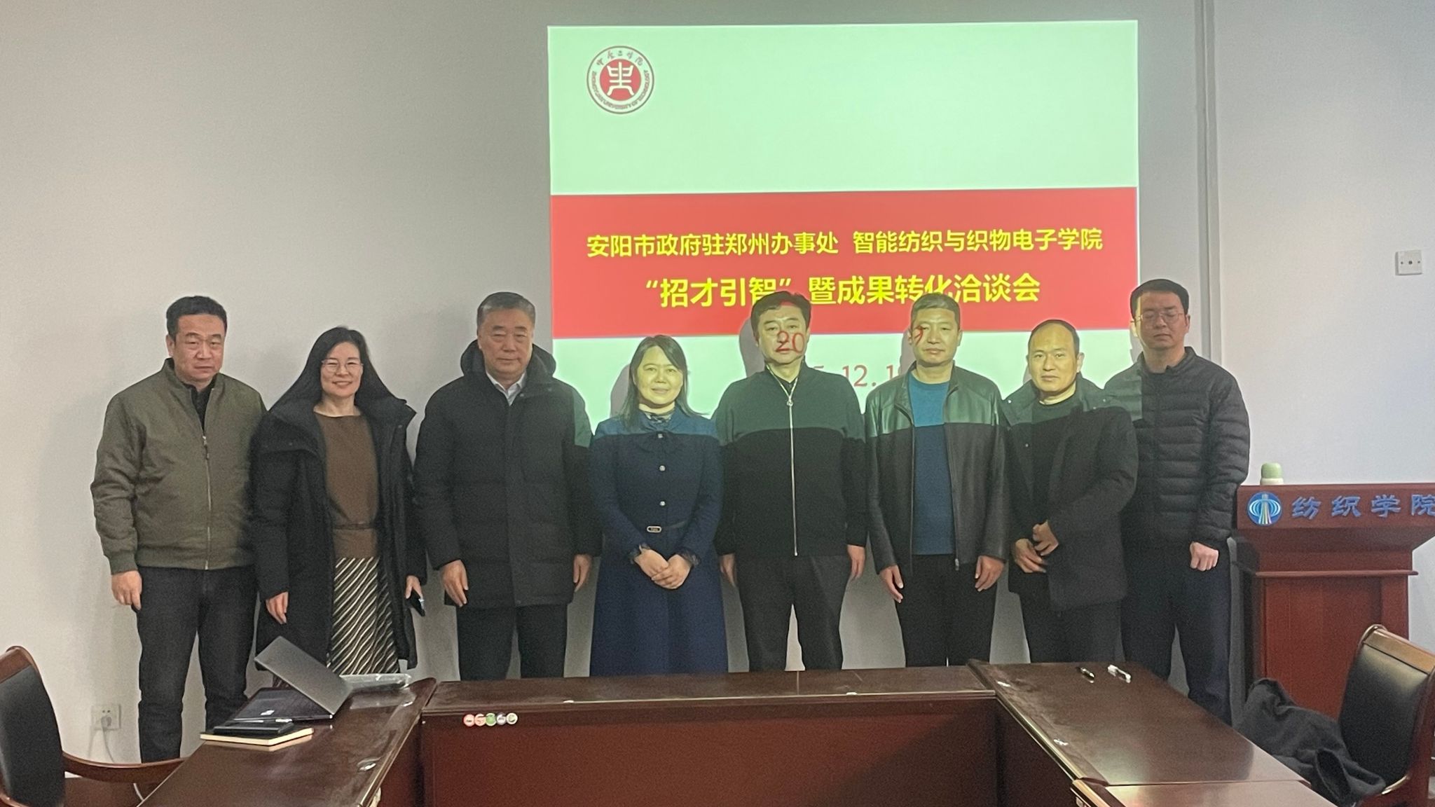 12月19日,智能纺织与织物电子学院与安阳市政府驻郑州办事处在我校龙湖校区二号组团C座202会议室举行“招才引智暨成果转化洽谈座谈会”,旨在深化校地合作,通过招才引智与成果转化双轮驱动,服务区域经济高质量发展,助力纺织类毕业生高质量就业。安阳市政府驻郑州办事处主任王昕、副主任王建成,智能纺织与织物电子学院院长杨红英教授、党委书记吕继东、副院长陈彩虹、党委副书记杨方超、任家智教授和教师代表参加了洽谈会。